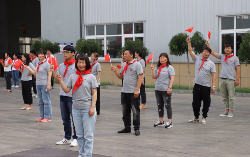 瑞豐達全體員臉上貼著國旗標志,手拿中國國旗并佩戴紅領巾,滿面春風,神采飛揚。